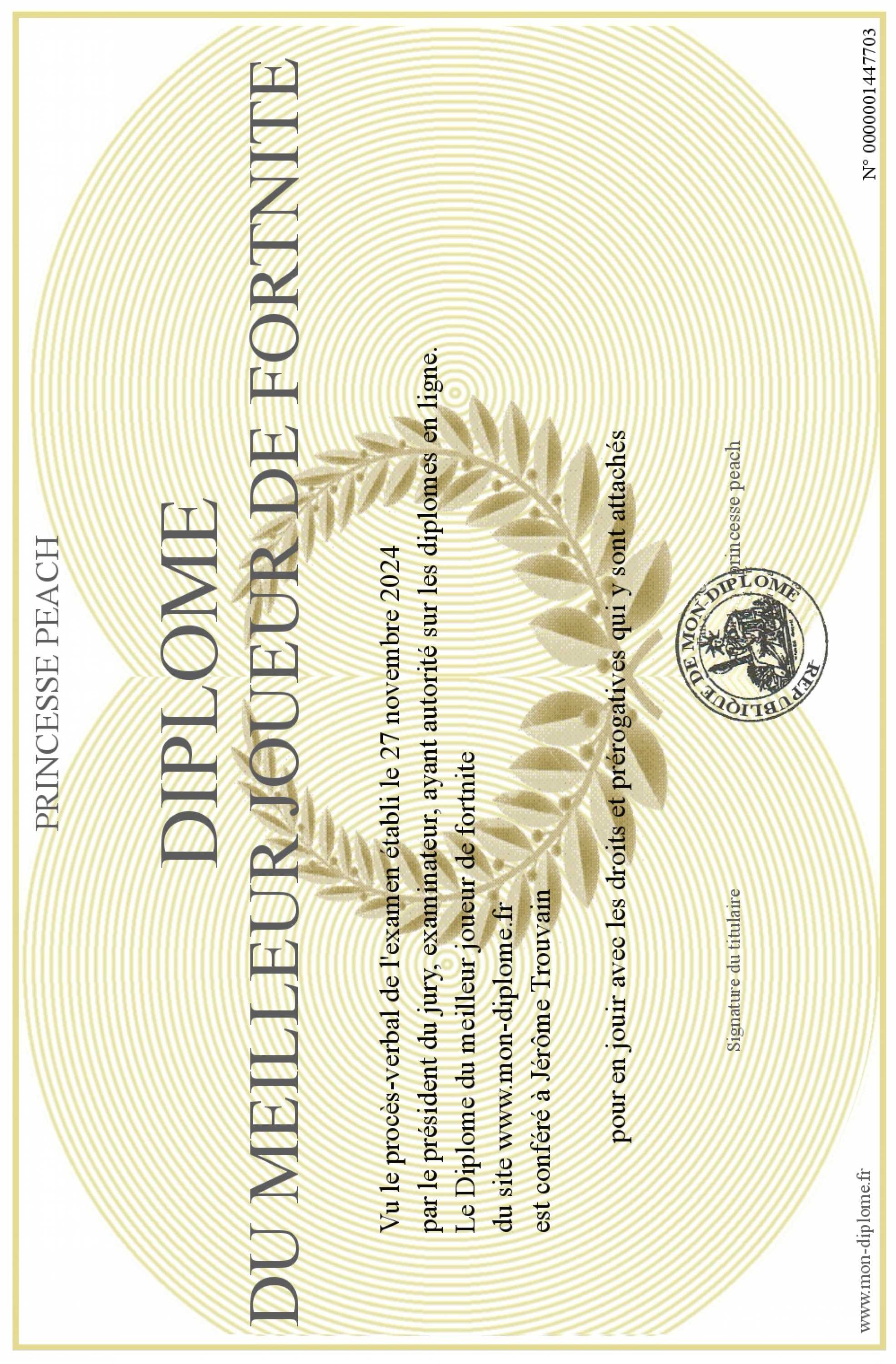 Envoyez par email votre Diplôme du meilleur joueur de fortnite personalisé