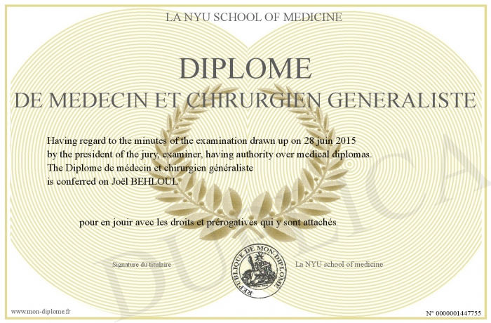Envoyez par email votre Diplôme de médecin et chirurgien généraliste personalisé
