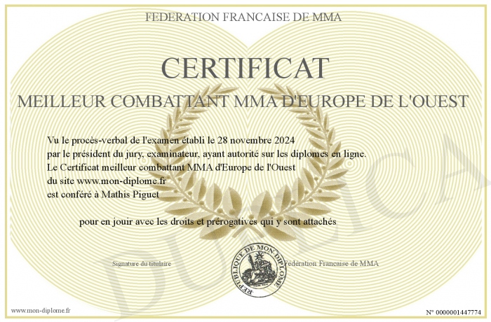Envoyez par email votre Certificat meilleur combattant MMA d'Europe de l'Ouest personalisé