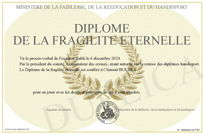 Envoyez par email votre Diplôme de la fragilité éternelle personalisé