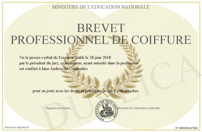 Envoyez par email votre Brevet Professionnel de coiffure personalisé