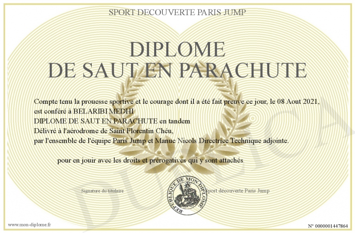 Envoyez par email votre DIPLOME DE SAUT EN PARACHUTE personalisé