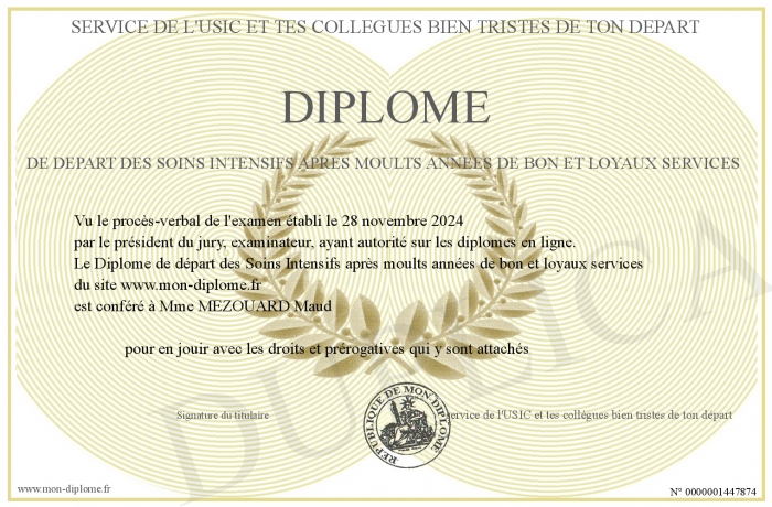Envoyez par email votre Diplôme de départ des Soins Intensifs après moults années de bon et loyaux services personalisé
