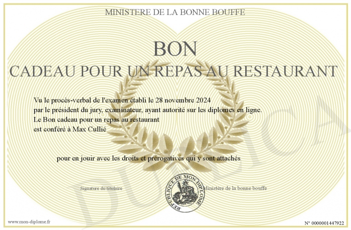 Envoyez par email votre Bon cadeau pour un repas au restaurant personalisé