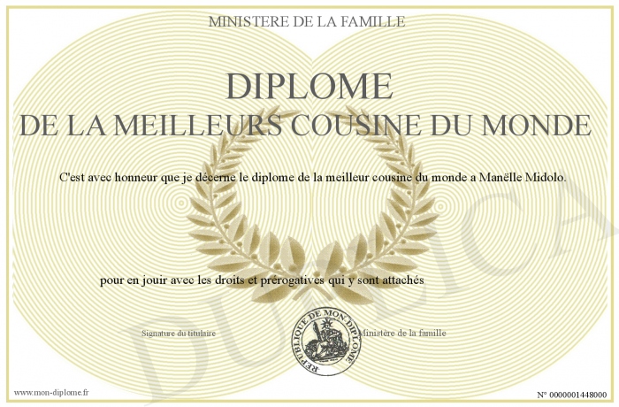 Envoyez par email votre Diplôme de la meilleurs cousine du monde personalisé