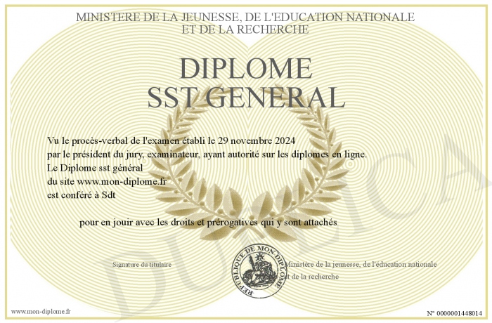Envoyez par email votre Diplôme sst général personalisé