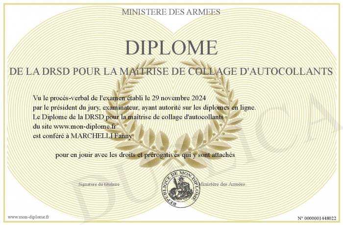 Envoyez par email votre Diplôme de la DRSD pour la maîtrise de collage d'autocollants personalisé