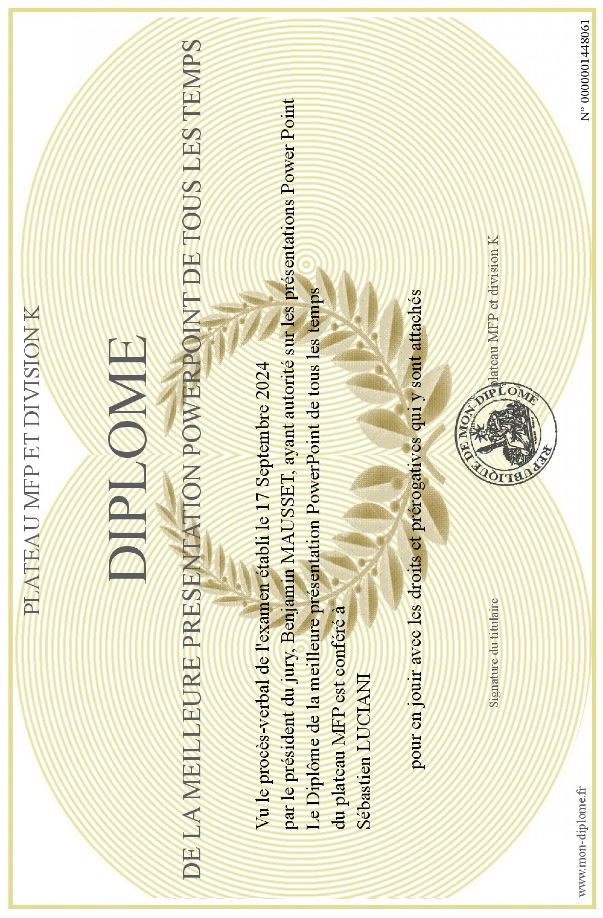 Envoyez par email votre Diplôme de la meilleure présentation PowerPoint de tous les temps personalisé