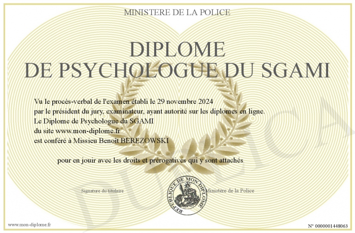 Envoyez par email votre Diplôme de Psychologue du SGAMI personalisé