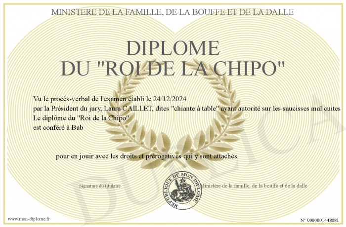 Envoyez par email votre Diplôme du -Roi de la Chipo- personalisé