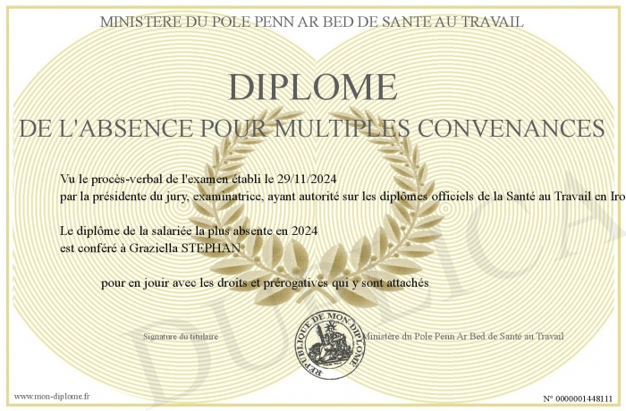 Envoyez par email votre Diplôme de l'absence pour multiples convenances personalisé