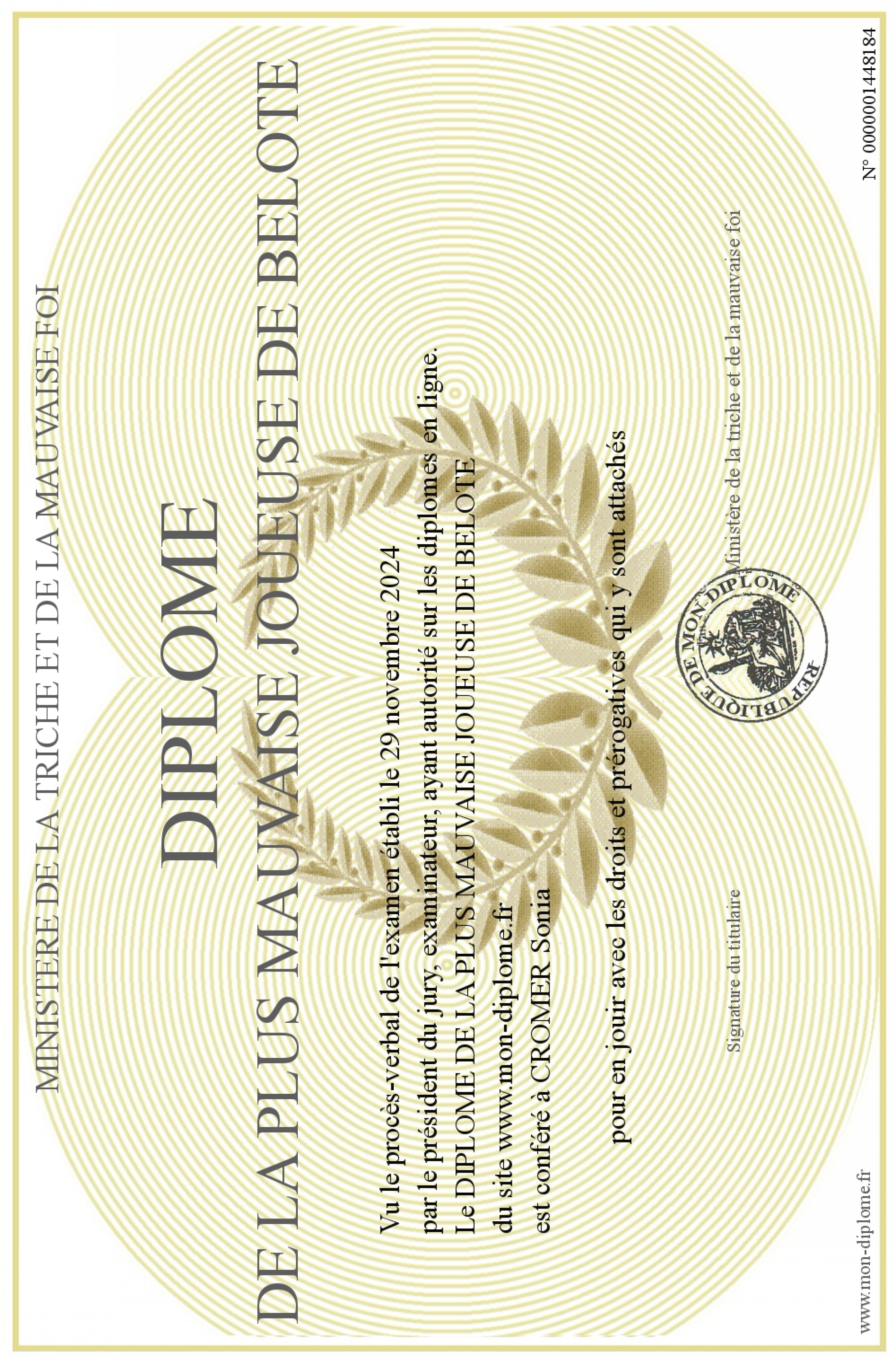 Envoyez par email votre DIPLOME DE LA PLUS MAUVAISE JOUEUSE DE BELOTE personalisé