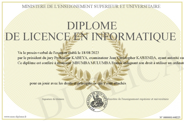 Envoyez par email votre Diplôme de licence en informatique personalisé