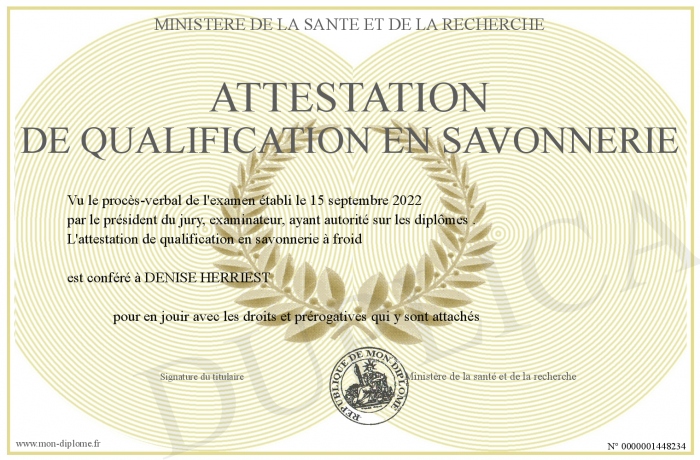 Envoyez par email votre ATTESTATION DE QUALIFICATION EN SAVONNERIE personalisé