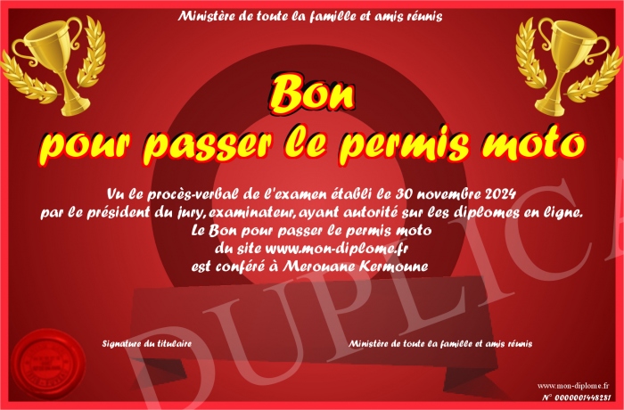 Envoyez par email votre Bon pour passer le permis moto personalisé