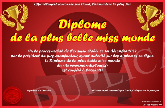 Envoyez par email votre Diplôme de la plus belle miss monde personalisé