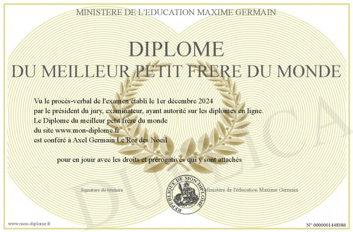 Envoyez par email votre Diplôme du meilleur petit frère du monde personalisé