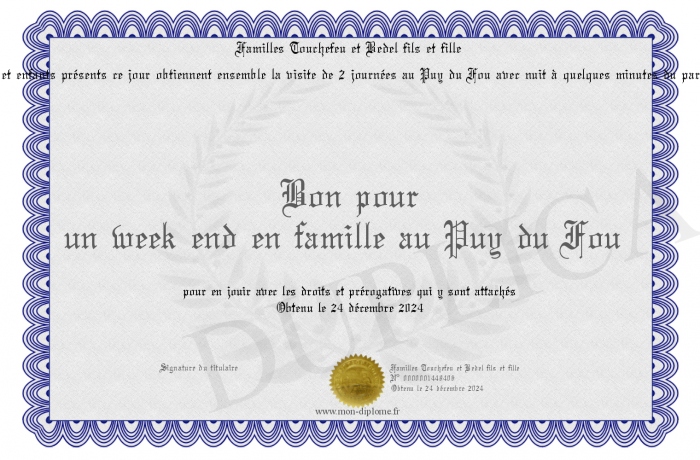 Envoyez par email votre Bon pour un week end en famille au Puy du Fou personalisé