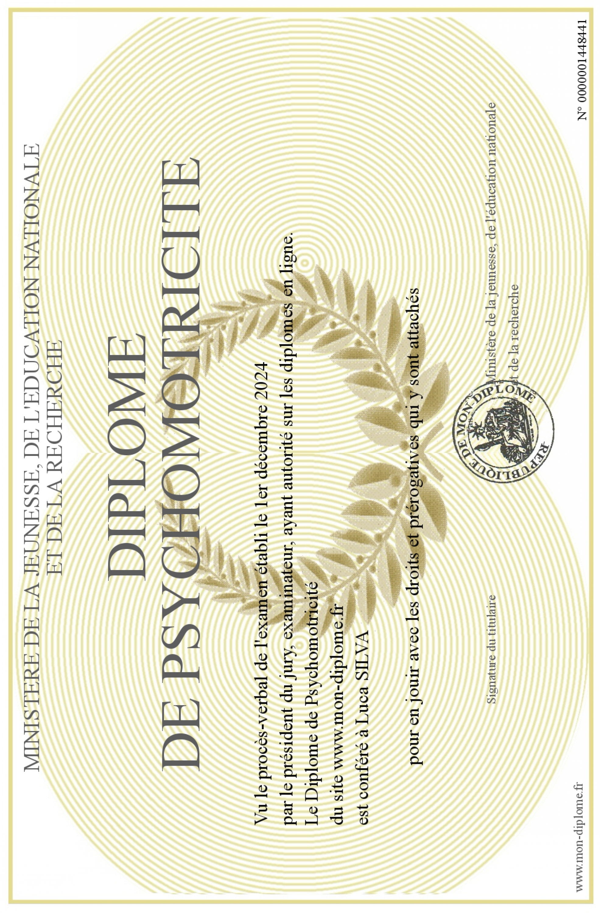 Envoyez par email votre Diplôme de Psychomotricité personalisé