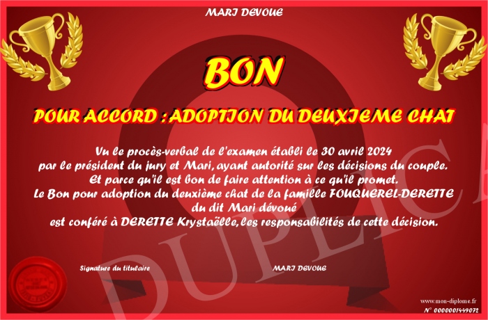 Envoyez par email votre BON POUR ACCORD : ADOPTION DU DEUXIEME CHAT personalisé