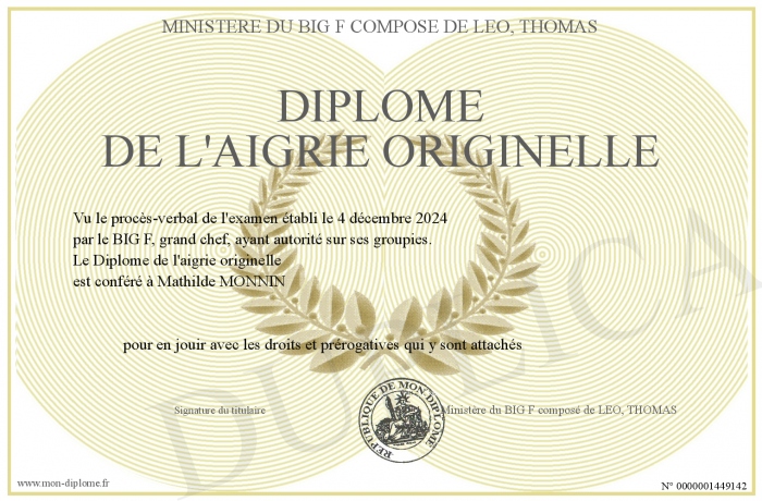 Envoyez par email votre Diplôme de l'aigrie originelle personalisé