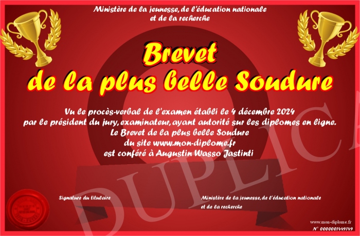 Envoyez par email votre Brevet de la plus belle Soudure personalisé