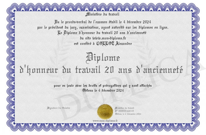 Envoyez par email votre Diplôme d'honneur du travail 20 ans d'ancienneté personalisé