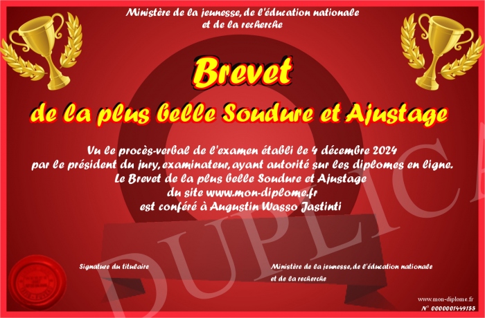 Envoyez par email votre Brevet de la plus belle Soudure et Ajustage personalisé