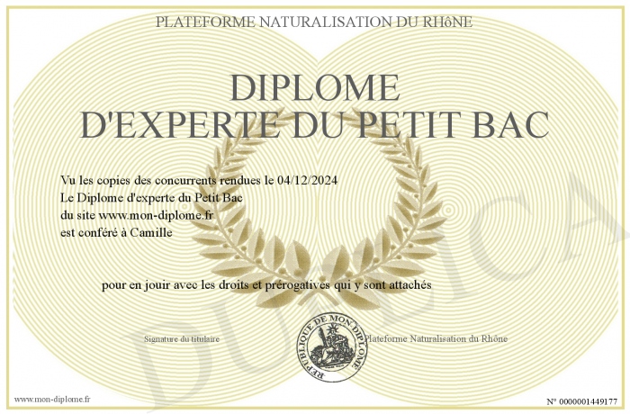 Envoyez par email votre Diplôme d'experte du Petit Bac personalisé