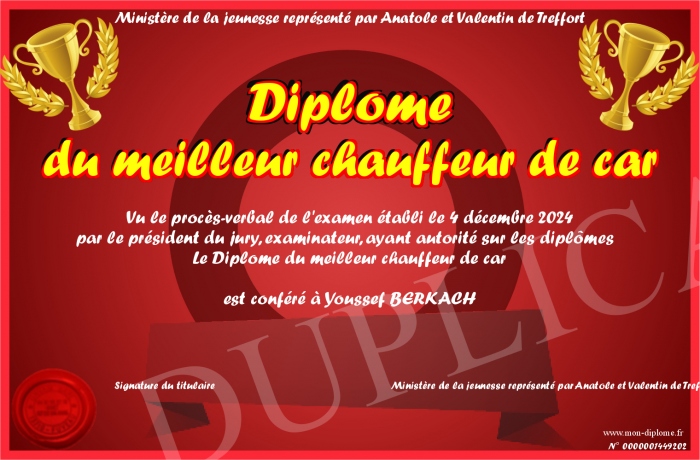 Envoyez par email votre Diplôme du meilleur chauffeur de car personalisé