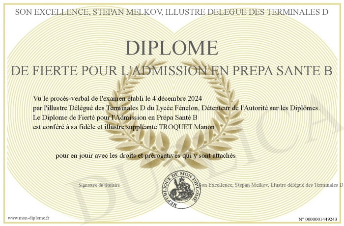 Envoyez par email votre Diplôme de Fierté pour l'Admission en Prépa Santé B personalisé