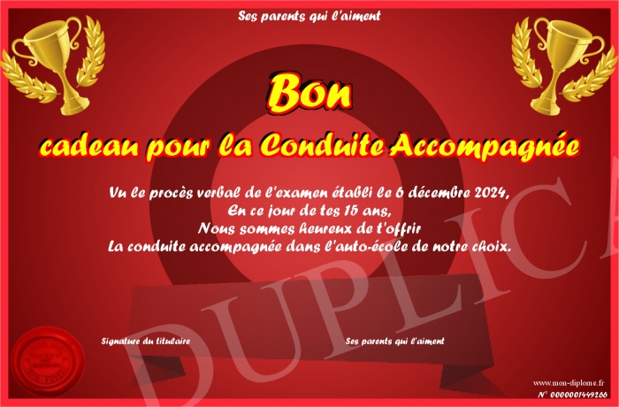 Envoyez par email votre Bon cadeau pour la Conduite Accompagnée personalisé