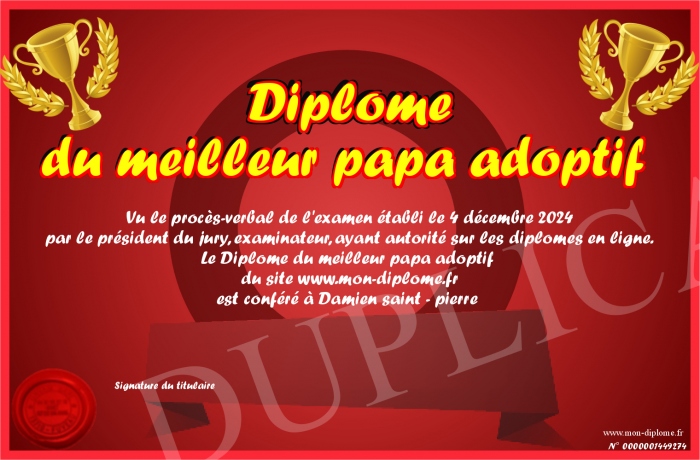 Envoyez par email votre Diplôme du meilleur papa adoptif personalisé