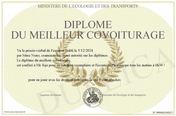 Envoyez par email votre Diplôme du meilleur covoiturage personalisé