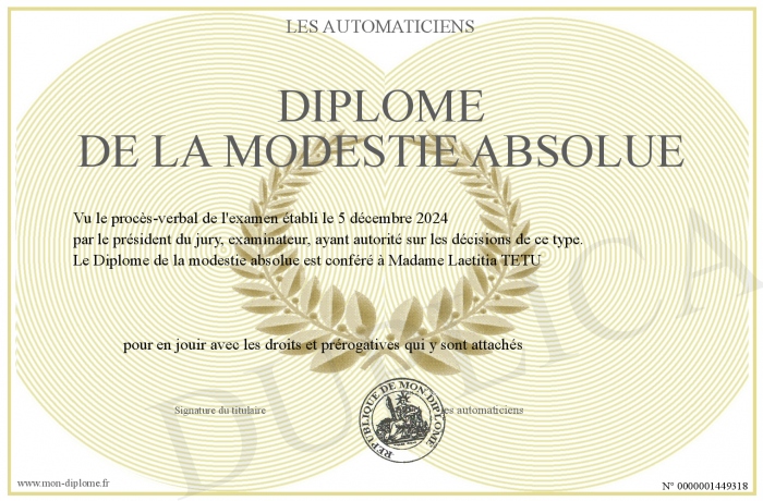 Envoyez par email votre Diplôme de la modestie absolue personalisé