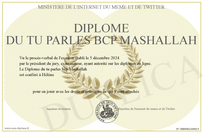 Envoyez par email votre Diplôme du tu parles bcp Mashallah personalisé