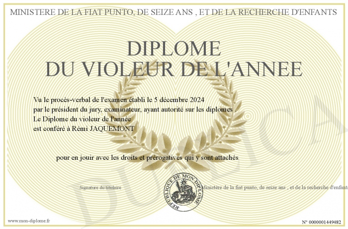 Envoyez par email votre Diplôme du violeur de l'année personalisé