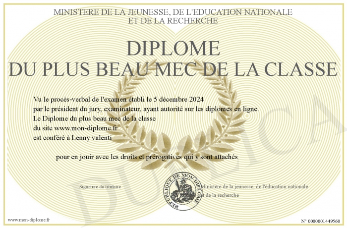 Envoyez par email votre Diplôme du plus beau mec de la classe personalisé