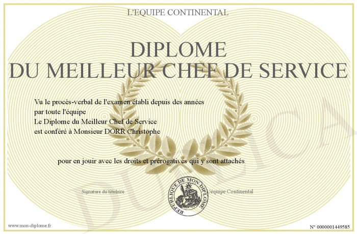 Envoyez par email votre Diplôme du Meilleur Chef de Service personalisé