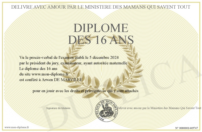 Envoyez par email votre diplôme des 16 ans personalisé