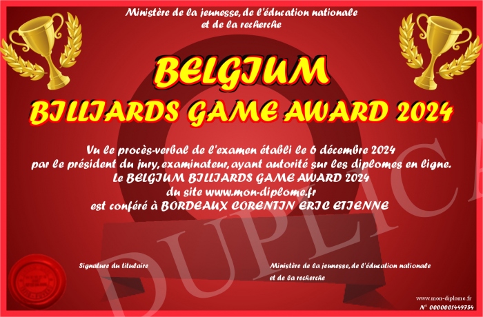 Envoyez par email votre BELGIUM BILLIARDS GAME AWARD 2024 personalisé