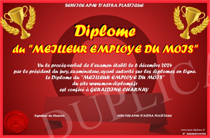 Envoyez par email votre Diplôme du -MEILLEUR EMPLOYE DU MOIS- personalisé