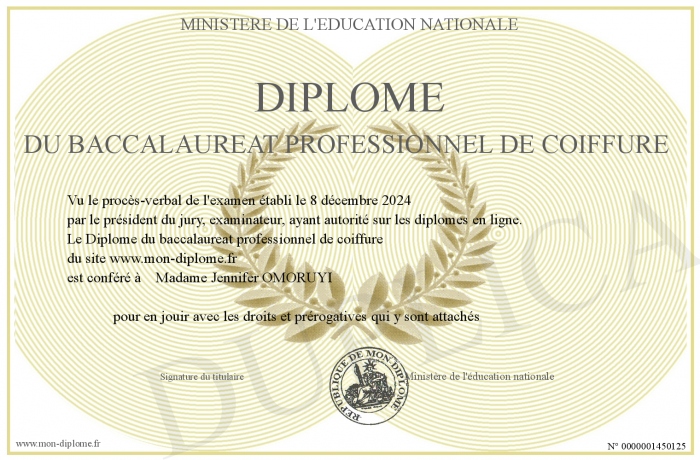 Envoyez par email votre Diplôme du baccalaureat professionnel de coiffure personalisé