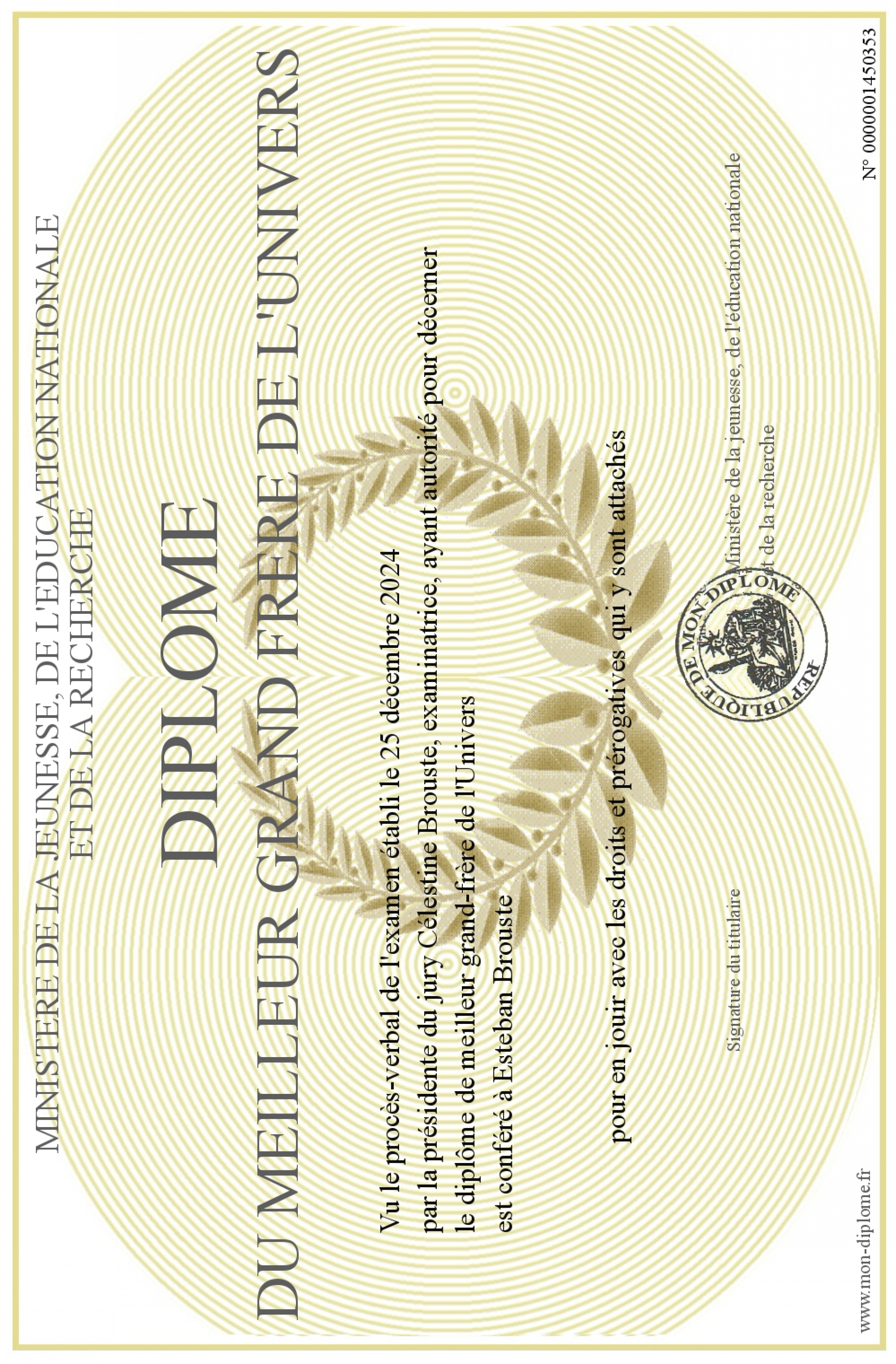 Envoyez par email votre Diplome du meilleur grand frère de l'Univers personalisé