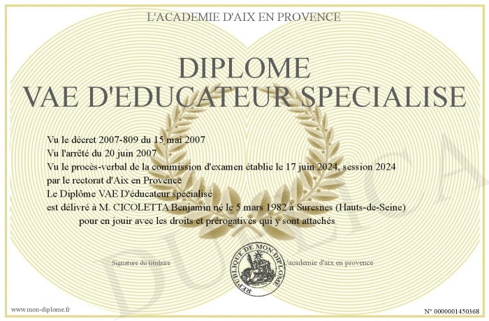 Envoyez par email votre Diplôme VAE D'éducateur spécialisé personalisé