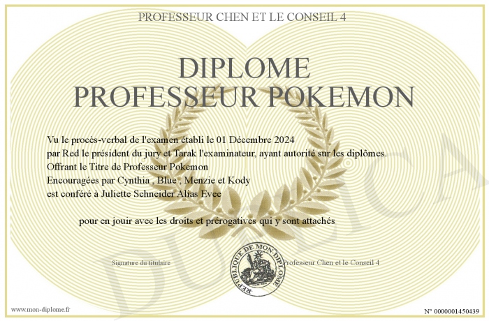 Envoyez par email votre Diplôme Professeur Pokemon personalisé
