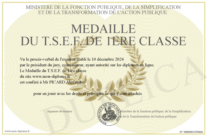 Envoyez par email votre Médaille du T.S.E.F. de 1ère classe personalisé