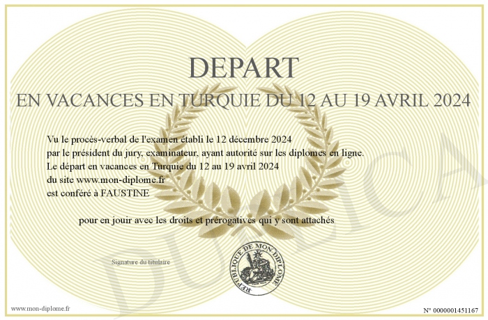Envoyez par email votre départ en vacances en Turquie du 12 au 19 avril 2024 personalisé