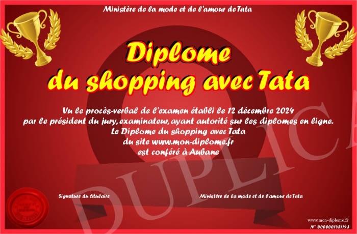 Envoyez par email votre Diplôme du shopping avec Tata personalisé