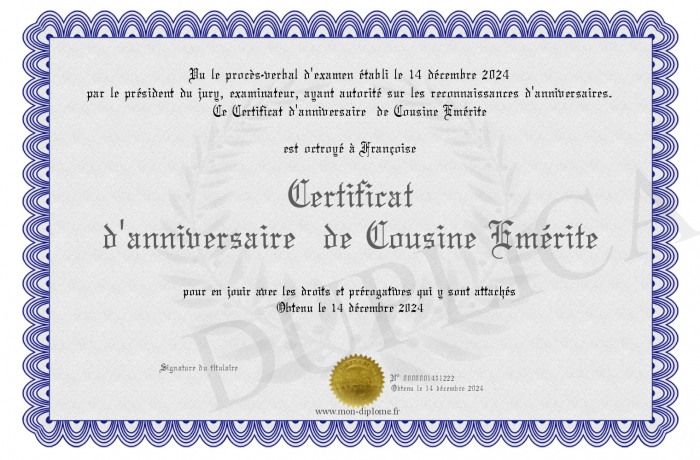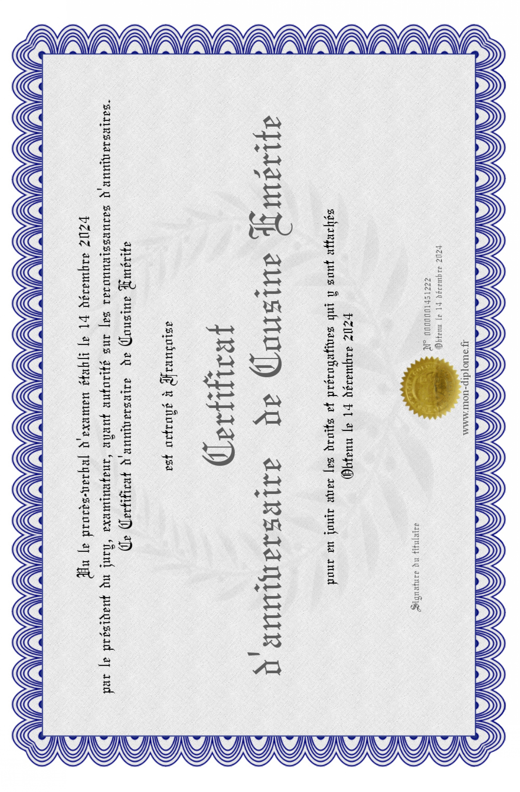 Envoyez par email votre Certificat d'anniversaire de Cousine Emérite personalisé